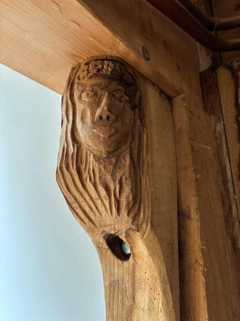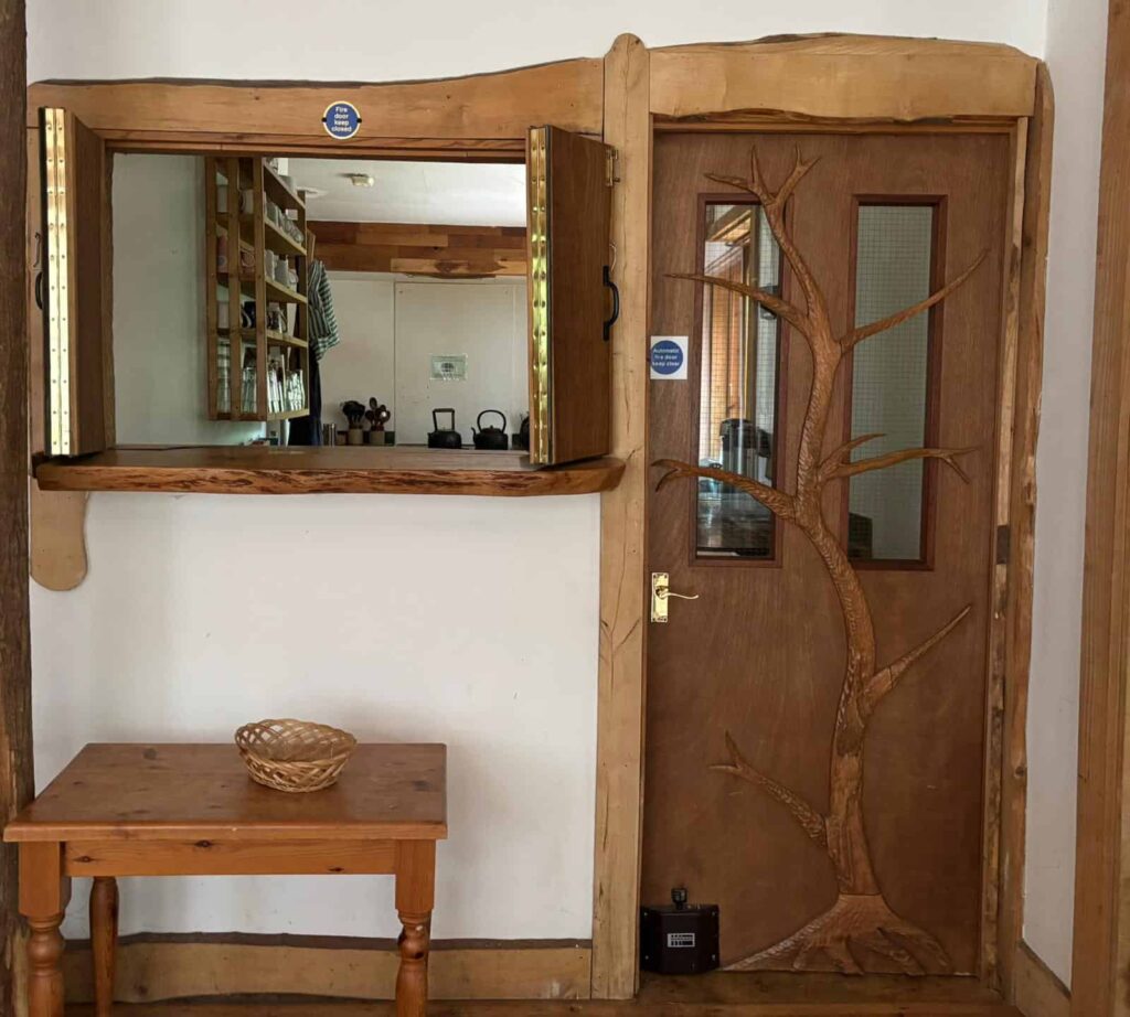 When first built, the Oak House had no kitchen: we continued to use the small kitchen in the Longhouse. In 2012 we built an extension, and created the new kitchen where two bedrooms had been. This work was led by professionals, and I had the bright idea of getting two creative craftsmen involved, who were in friendly competition to create interesting features. See if you can spot the copper grapevine, and the mouse, owl and other features carved into the wood.